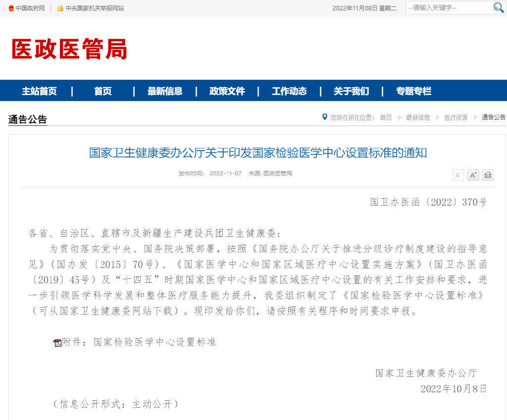 11月7日,国家卫生健康委官网发布《关于印发国家检验医学中心设置标准的通知》。