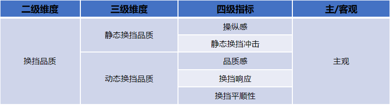 在驾乘评价日前发布的《汽车驾乘性体验测试评价规程》团体标准中(以下简称团标),针对[换挡品质]给出了具体的测试评价内容和方法,其中包括静态换挡品质和动态换挡品质两大二级维度。