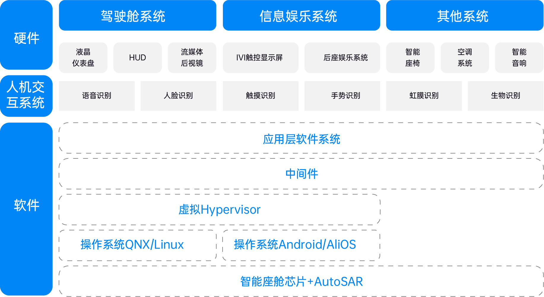 目前智能座舱主要由硬件(仪表盘、中控导航、HUD、流媒体后视镜、智能空调控制等其他系统)、软件(操作系统、虚拟层、中间件、应用软件)、人机交互(语音识别、人脸识别、触摸识别、手势识别、虹膜识别、生物识别)三大逻辑部分构成。